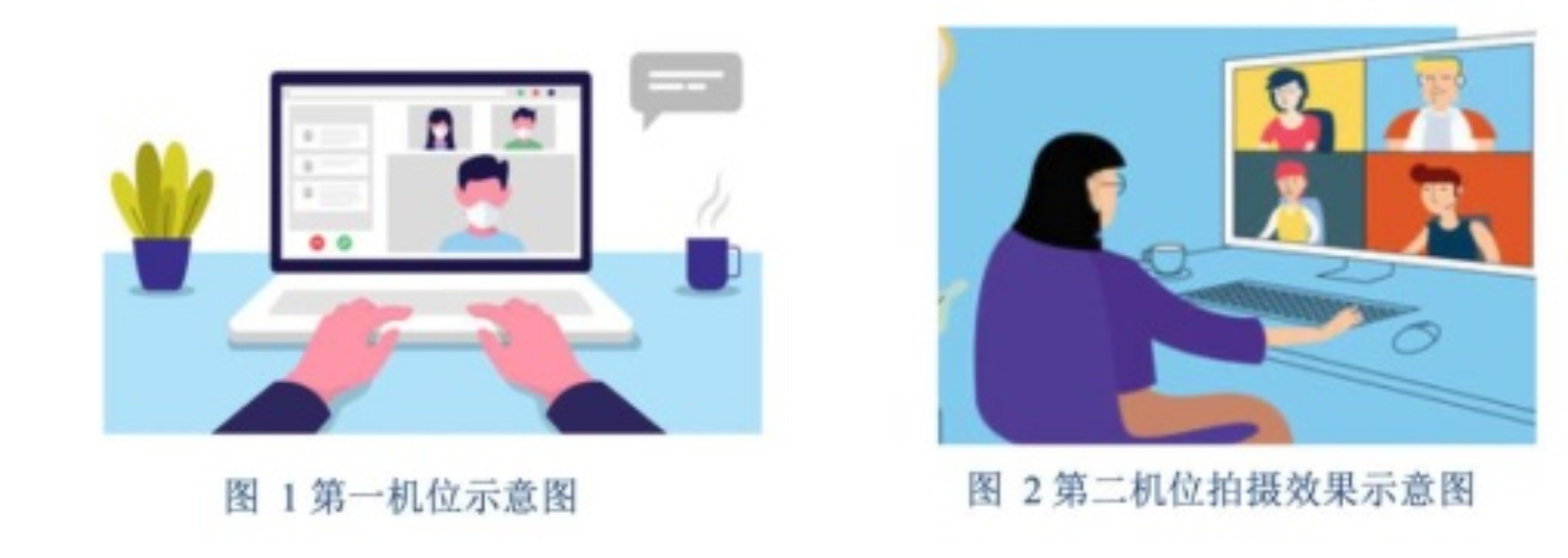 4.考生需要准备可以支撑“双机位”运行的硬件,即需要两部带摄像头的设备及附件,第一机位可以是电脑或手机,第二机位只能为手机(建议第一机位首选有线网+电脑)。复试开始后,考生需首先将第二机位的摄像头360度环顾四周,以确保复试环境符合要求。一台设备(第一机位)从正面拍摄,放置在距离本人30cm处,另一台设备(第二机位)从考生侧后方45°距离本人30cm处拍摄,确保第一机位和第二机位分别从考生面前和身后完整拍摄到考生全身,复试组考官能够从第二机位清晰看到第一机位屏幕。效果图如下:
