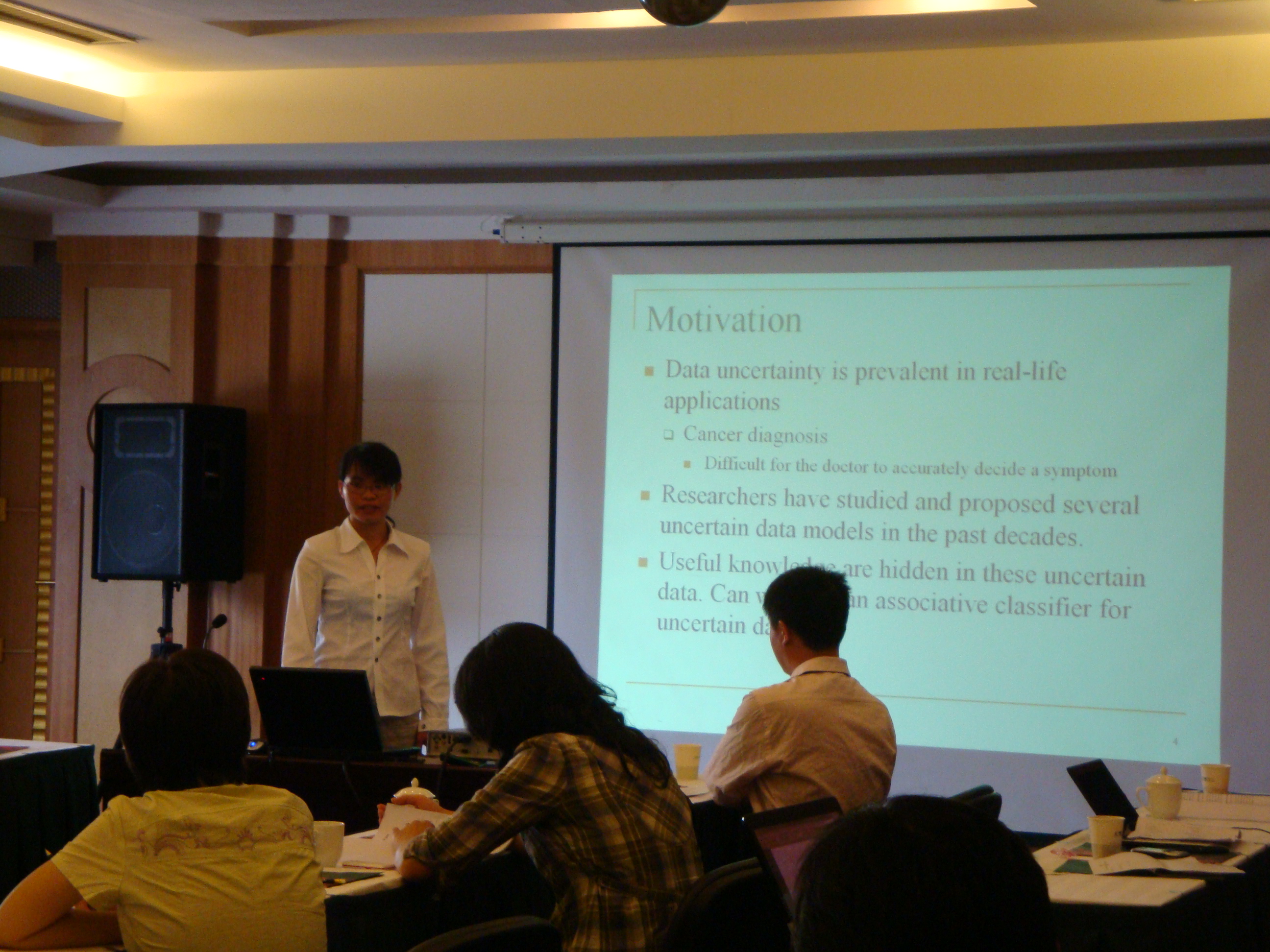 beat365官网副院长张阳教授和2008级研究生覃香菊同学参加了此次大会。张阳教授应邀作为此次大会Knowledge Discovery分会场的主席,同时覃香菊同学在此分会场就其被录用的论文“Associate Classifier for Uncertain Data”做了报告。