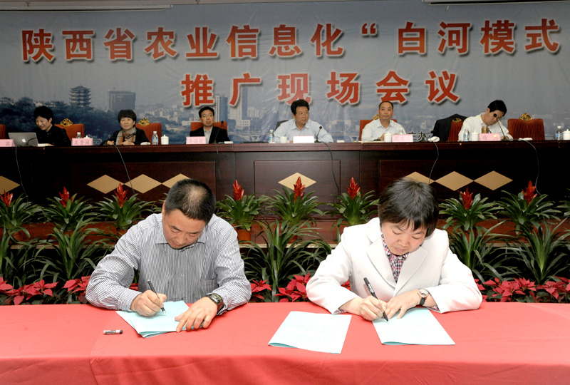 2012年4月19日,由陕西省工信厅、省农业厅共同主办的全省农业信息化“白河模式”推广现场会在安康市召开,beat365官方网站院长李书琴和张阳副院长参加了会议。会议期间,赴白河县参观了县农业综合信息中心、县网络医疗会诊中心以及茅坪镇金花村、枣树村农村综合信息服务站,现场参观学习白河县在农业农村信息化中的好经验、好做法。在随后召开的全省农业信息化会议上,学院与陕西省农业宣传信息中心签定了《关于推进陕西农业农村信息化建设框架协议》。
