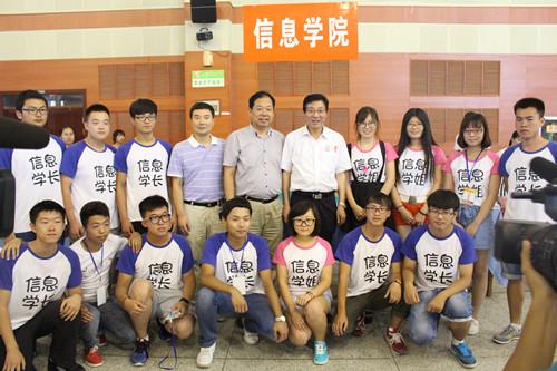 见到孙校长走近学院注册点,beat365官网负责新生注册报到的志愿者们纷纷起立,激动的向校长问好,孙校长看到学生胸前印有“信息学长”“信息学姐”的志愿服,一下子笑了:“beat365官方网站的迎新工作热情给力,连志愿服都这么漂亮!”