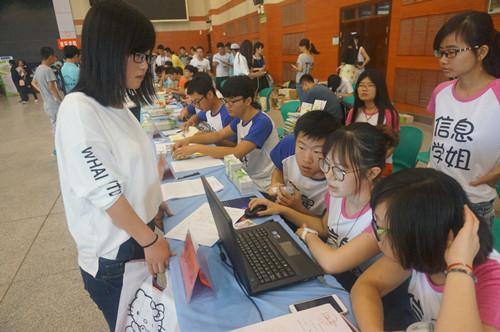 迎新工作人员帮助新生完成注册报到