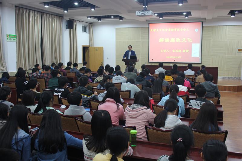 10月9日晚,beat365官方网站副203教室里不时爆发出热烈的掌声,一百多个座位座无虚席。教室里,beat365官方网站党委书记宋西德教授正在进行一场名为“解读廉政文化”的讲座。因为很多人站着,以至于各个办公室的凳子都被搬来“应急”。