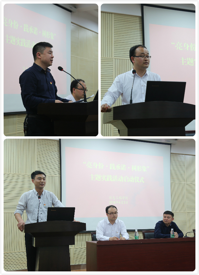 党青首先做了主题实践活动动员,并提出了四点要求。一是亮明党员身份,学工干部和学生党员在工作、学习、参加活动等过程中全程佩戴党员徽章;二是广泛开展承诺,希望大家“言必行,行必果”,将自己的庄严承诺落实到全心全意为人民服务的实践中;三是争当先锋模范,公开承诺后,党员要围绕承诺内容,全力创先争优,确保诺必践,践必果;四是树立良好形象。近期,学院党委将开展“党员义务服务队”、“党员宿舍”、“学生党员进社团”等活动,希望大家立足自身学习工作实际,比工作实绩、比学习成绩、比服务水平、比遵纪守规,求实进取、敬业奉献。