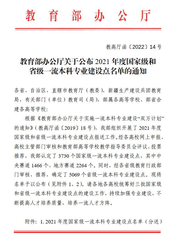 近日,教育部办公厅印发了《关于公布2021年度国家级和省级一流本科专业建设点名单的通知》(教高厅函﹝2022﹞14号),正式公布了2021年度一流本科专业建设“双万计划”建设点名单。beat365官网软件工程专业入选国家级一流本科专业建设点,实现了国家级一流本科专业零的突破。