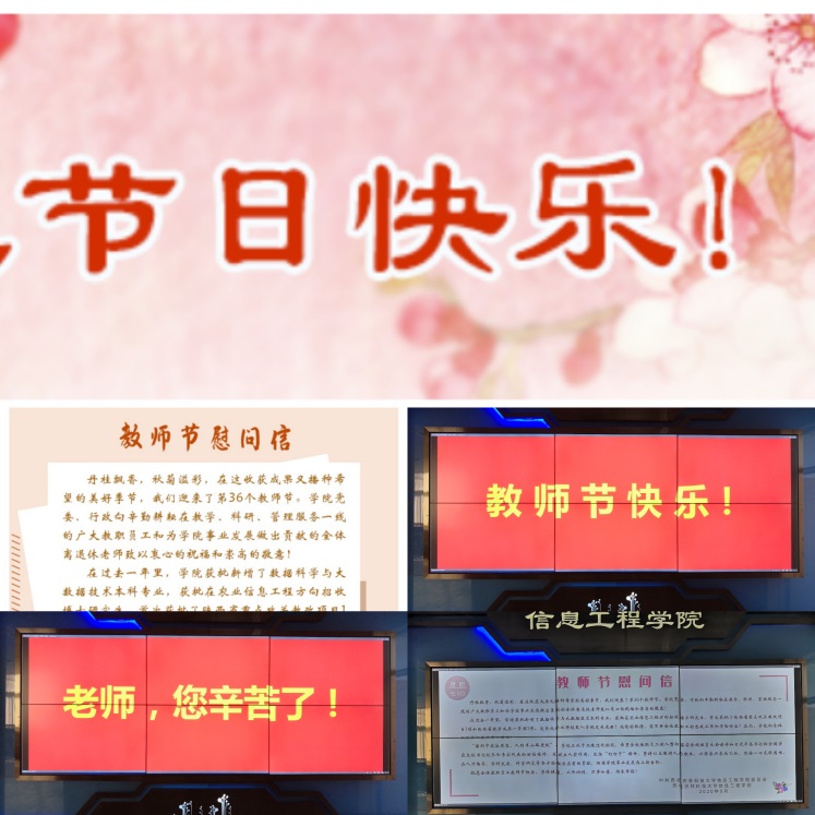 广泛宣传,营造浓厚氛围。在第36个教师节来临之际,beat365官网在网站悬挂了“老师,您辛苦了!祝您节日快乐!”的横幅,发布了设计精美的致全院教职工的一封信,对全院教职工表达了节日慰问;还通过电子屏持续为教师亮灯,滚动播放了“老师,您辛苦了!”“教师节快乐!”等暖心话语。