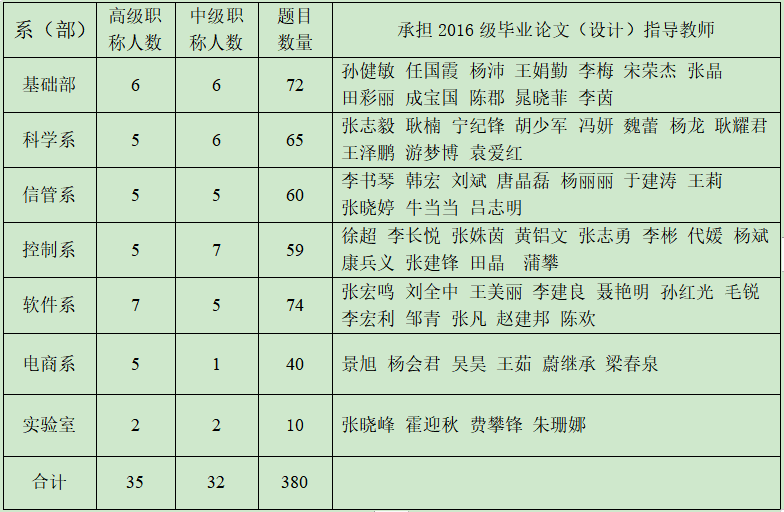根据学校本科毕业论文(设计)工作规范要求,指导教师应有实际的设计、实验或研究工作经验,能为人师表,对学生思想品德的陶冶起有益的作用,即指导教师既要教书,又要育人。对毕业论文(设计)的业务指导,应把重点放在培养学生的独立工作能力和创新能力方面。为保证学生毕业论文(设计)质量,结合beat365官网实际,高级职称指导教师指导学生人数不超过7人,中级职称指导教师指导学生人数不超过5人(正在攻读学位的教师独立指导学生人数不超过3人)。按以上规定计算,各系(部)拟提交的本科毕业论文(设计)题目数不超过表中数量。