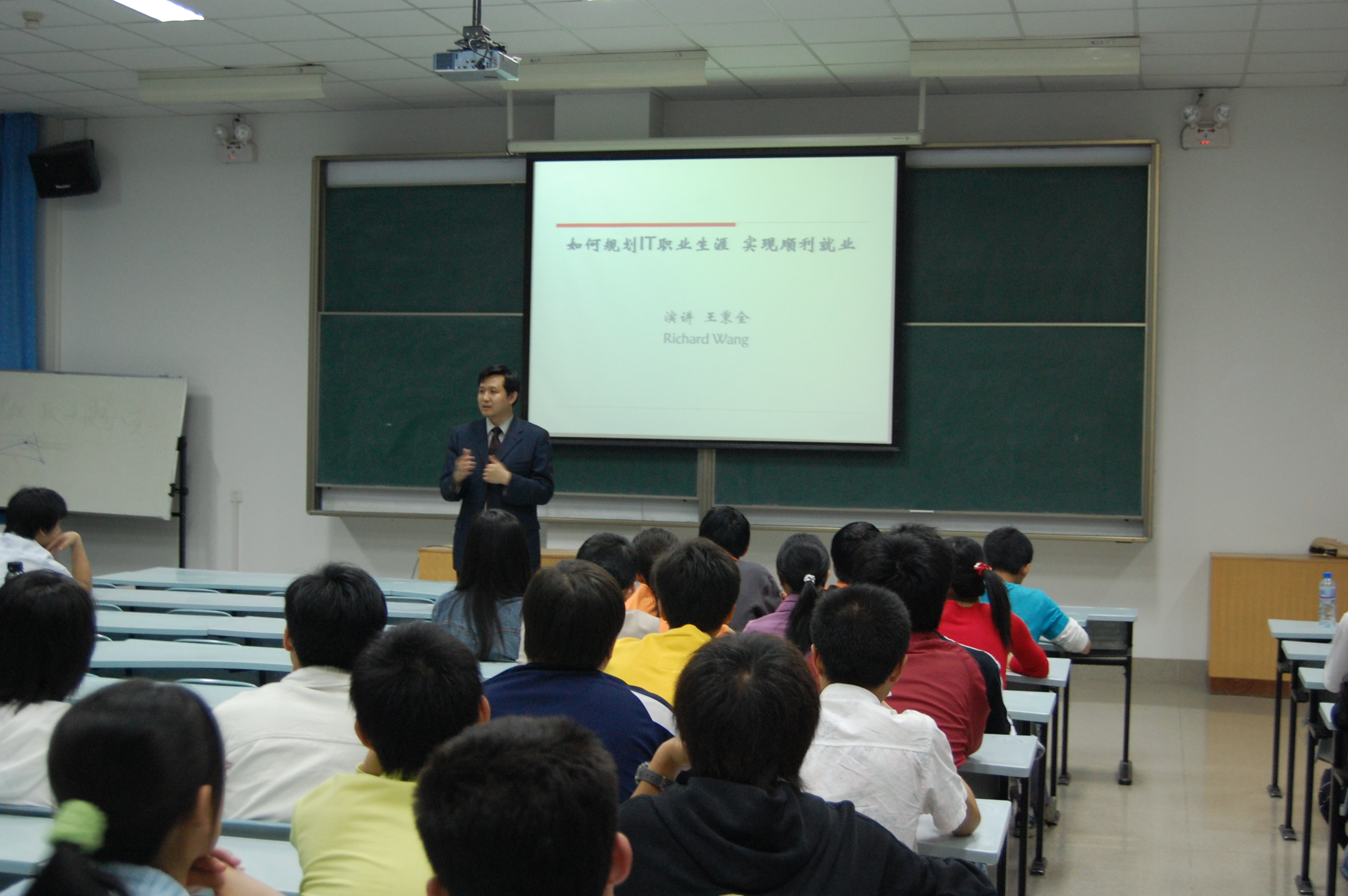 王秉全(Richard Wang),加籍华人, 计算机博士。王博士从自己的成长经历谈起,结合自己多年来在工作中积累的宝贵经验,声情并茂地向学院师生讲述了作为当代信息类大学生该如何规划自己的IT职业生涯。他讲述了当前高校专业设置和企业职业岗位之间的联系,倡议同学们要正确珍惜大学学习机会,逐渐培养自己的学习能力和自觉学习意识。特别强调指出高校专业课程设置是成体系的,告诉学生所学知识要系统,前后要能连接在一起。王博士还结合自己多年招聘毕业生的经验向学生讲述了怎样做一份好的简历,怎样在简历中凸现自己的闪光点。并现场向大家展示了几份制作精美的简历。最后王博士用幽默风趣的语言向师生阐述了IT人成长的一般规律,并向大家提出了几点建议。
