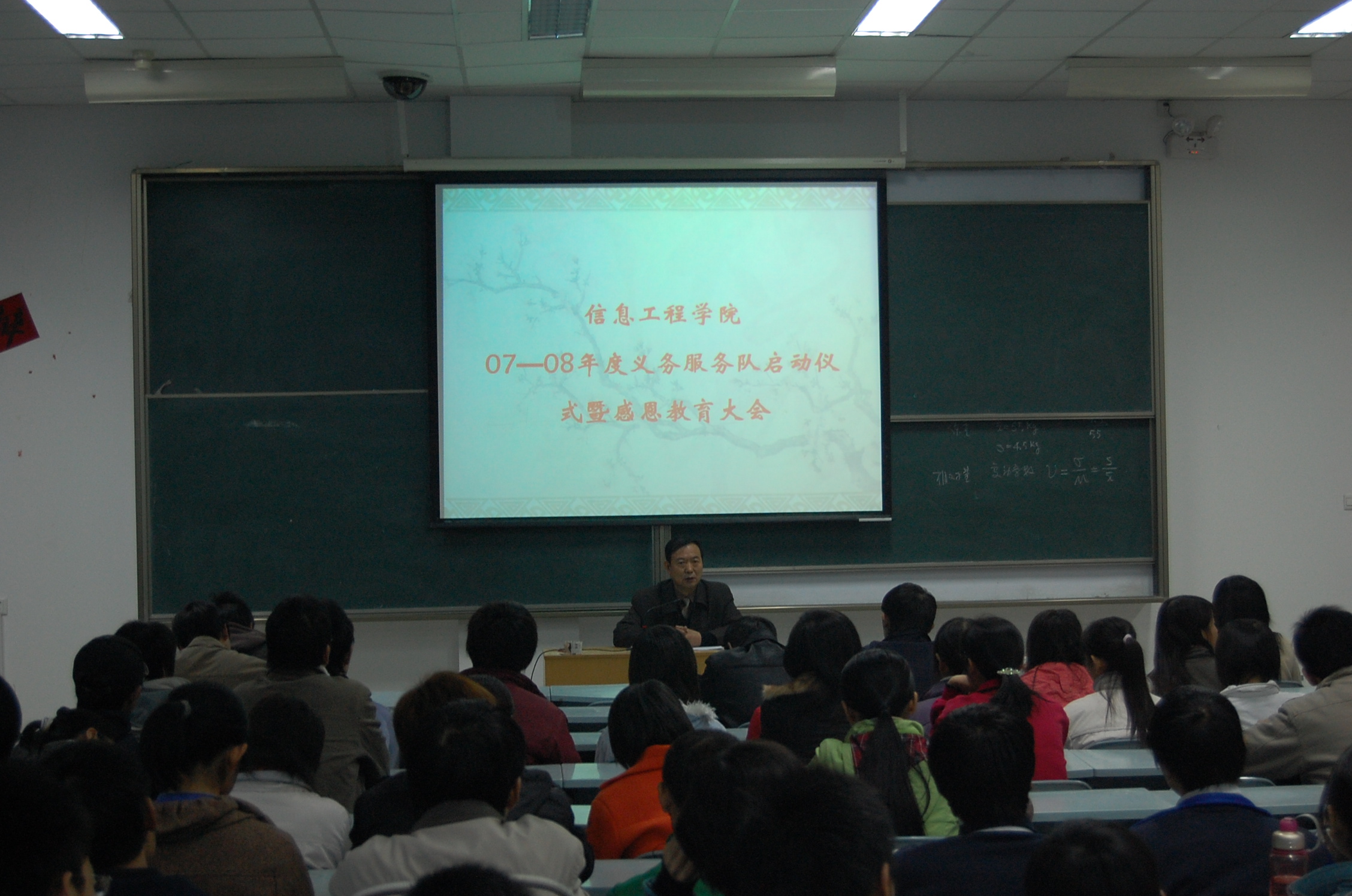 11月30日下午,beat365官方网站召开了2007?2008学年度大学生义务服务队启动仪式暨感恩教育大会。beat365官方网站党委书记樊世明老师、辅导员谷申杰老师、王淑珍老师以及250余名队员代表参加了教育大会。