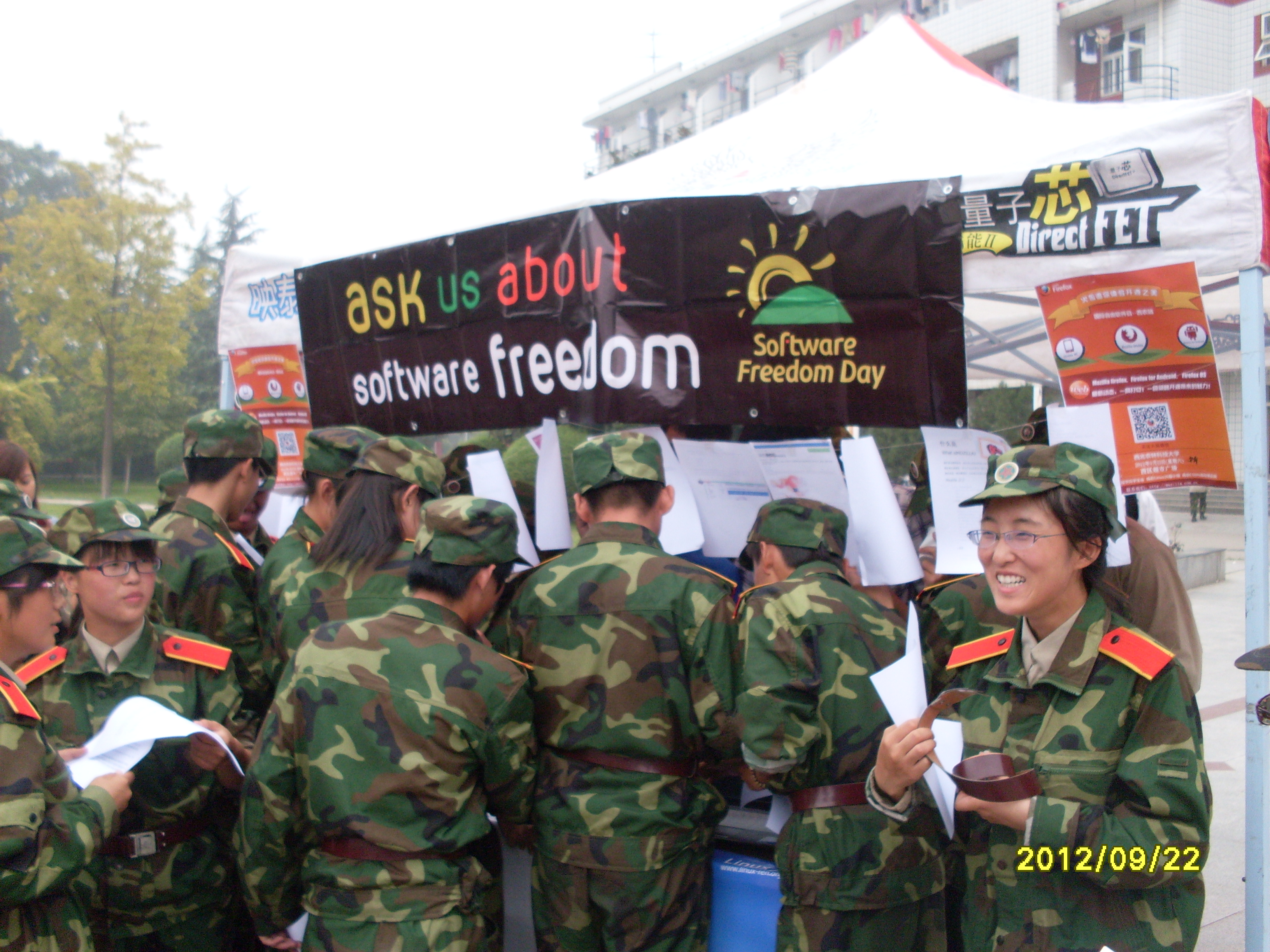 活动开始正值上午军训结束之时,吸引了大量军训新生,现场瞬间被迷彩“解放军”包围,答题、开源宣传、礼品发放有序进行,活动也进入高潮,在现场刮起了绚烂的“开源风”。随着活动推进,现场人来人往,也吸引来了很多高年级同学,使自由软件日活动的举办更近一步,让更多人了解到了开源文化。