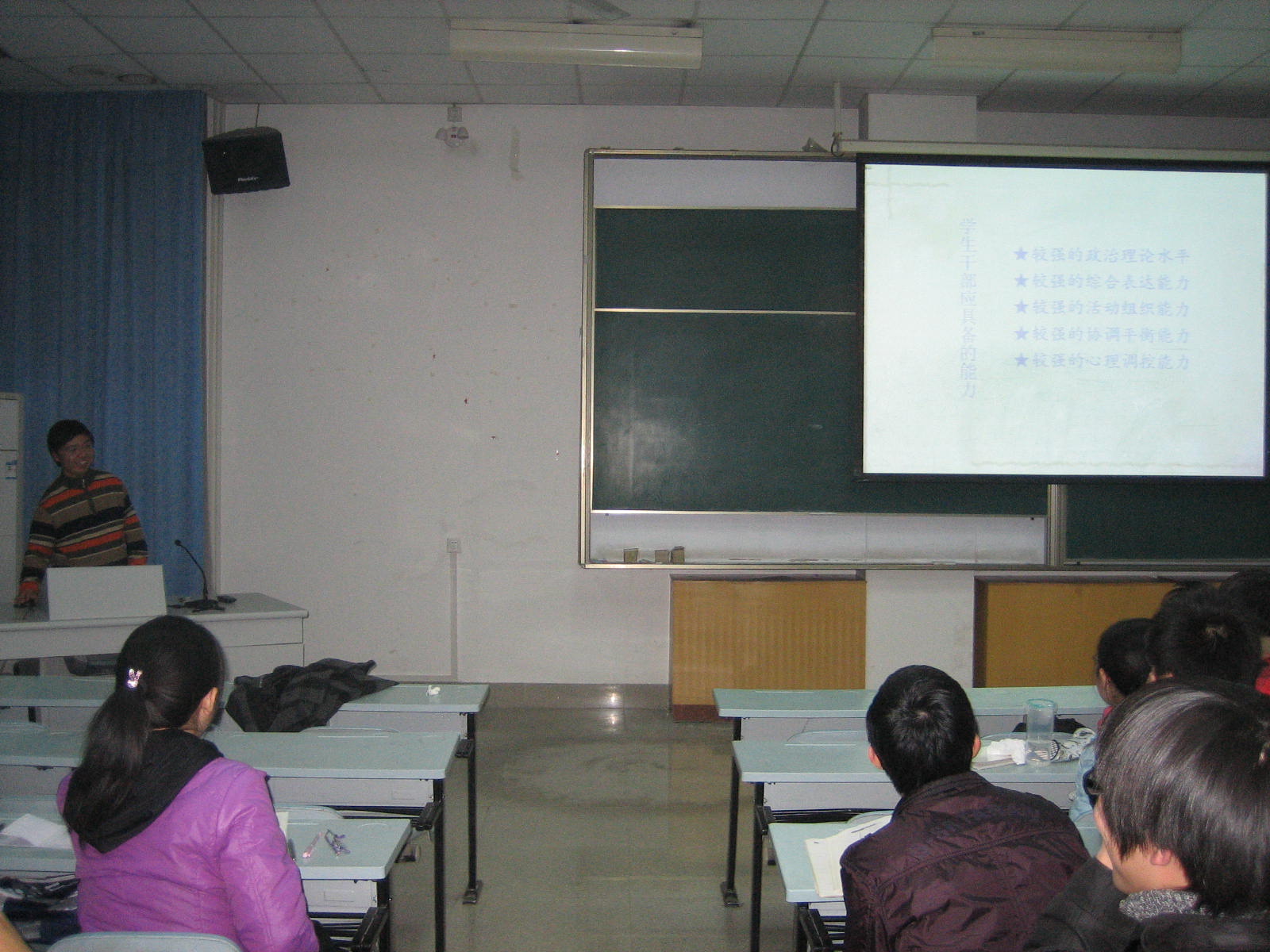 2011年12月16日,我院在M2教室举行了第八期团分校第六次课程讲座,由谷申杰老师为各班班委及部委做了一次精彩讲座。