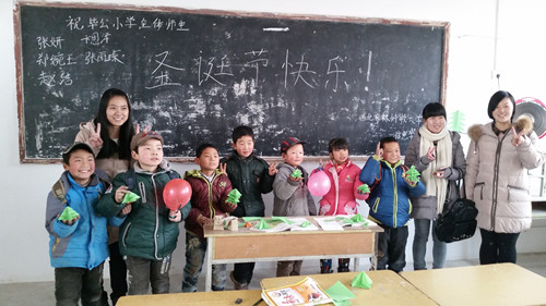 面对空空荡荡的教室,志愿者带领小朋友们用彩球装扮他们那略显寒冷的教室,让气球将他们的教室变得充满温馨、充满温暖。随后志愿者教小朋友用卡片动手做精美的圣诞树,让他们送给自己爸爸妈妈。最后,在铃儿响叮当的音乐声中志愿者们送小朋友们离开学校。